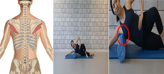 정면에서 바라봤을 때 손등이 더 많이 보인다면 대원근 단축을, 반대로 손바닥이 더 많이 보인다면 소원근 단축을 의심해봐야 하는데요. 이러한 대원근과 소원근을 풀어내는 방법 함께 알아보도록 할게요. 겨드랑이 아래 견갑골 외측면에 폼롤러를 대고 옆으로 눕습니다. 이때 팔은 위로 길게 뻗어야겠죠.