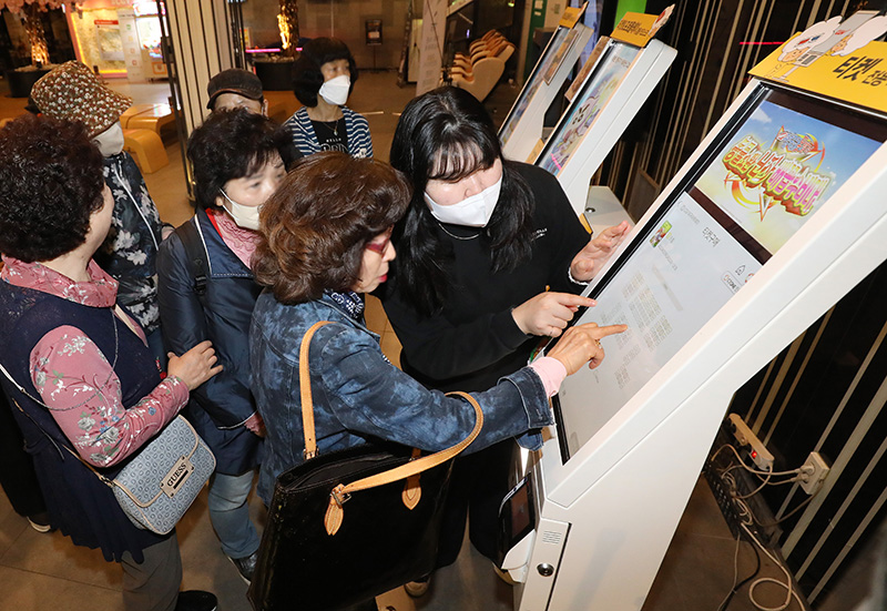 대구의 한 영화관에서 현장체험활동을 나온 대구내일학교 늦깎이 학습자들이 무인티켓판매기(키오스크) 사용법을 배운 뒤 직접 영화 티켓을 발권하고 있다. (ⓒ뉴스1, 무단 전재-재배포 금지)