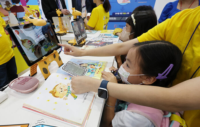 서울 강남구 코엑스에서 열린 2023 에듀테크 코리아 페어를 찾은 학생들이 증강현실(AR) 도서를 체험하고 있다. (ⓒ뉴스1, 무단 전재-재배포 금지)