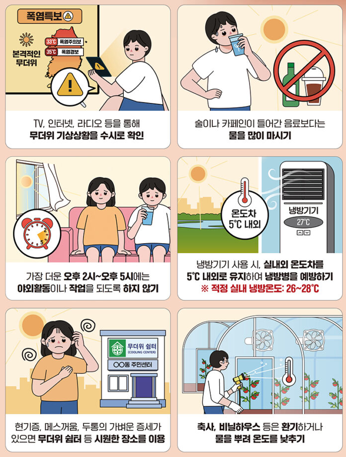 특히 땡볕이 강하게 내리쬐는 시간에는 가급적 실외 활동을 자제하고 야외에 있으면 서늘한 곳에서 휴식하거나 시원한 곳에 머물도록 하는데, 논·밭의 농작물은 아침저녁의 선선한 시간에 살피도록 한다.
