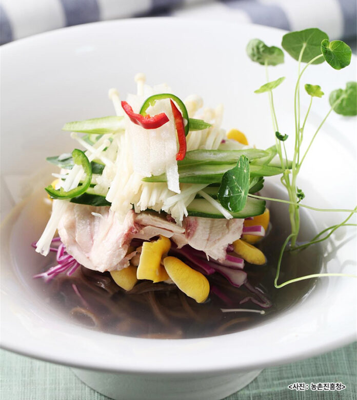 재료 : 닭 1/2마리, 노랑느타리버섯 100g, 팽이버섯 50g, 적채 30g, 오이 50g, 샐러리 20g, 배 20g, 풋고추 20g, 홍고추 10g, 소금 2g, 후추 0.2g, 참기름 4㎖, 잣 15g, 깨소금 20g, 메밀면 160g