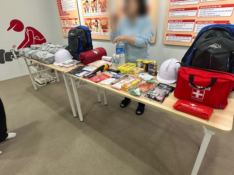 그다음 체험은 보건 안전 체험으로 일상생활 속 응급처치 방법을 교육받을 수 있습니다. 약 50분의 시간 동안 응급처치(심폐소생술, 자동심장충격기, 기도 폐쇄 대처법 실습), 밀집 공간 대피 자세 교육, 생존가방 꾸리는 법 등에 대해 교육받게 됩니다. 가장 인상 깊었던 체험은 심폐소생술 교육으로 심폐소생술의 정확도를 측정할 수 있는 시스템을 통해 모든 체험자가 자신의 심폐소생술이 얼마나 정확한지를 파악할 수 있는 부분이었습니다. 강사님의 설명을 듣고 각자의 자리에서 심폐소생술을 진행하는데, 심폐소생술이 끝난 후 화면을 통해 각자의 심폐소생술 완성도를 확인할 수 있습니다. 1차 심폐소생술 후, 강사님 및 보조 강사님의 피드백을 통해 2차 심폐소생술을 진행하는데, 개개인별 피드백을 통해 참여자 모두의 완성도가 올라갈 수 있었습니다.