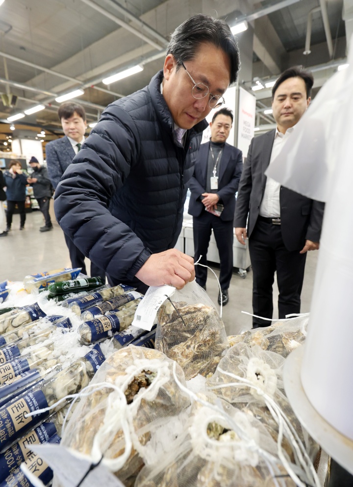 강도형 해양수산부 장관이 새해 첫 날인 1일 서울 강서구 등촌동 홈플러스 강서점에서 석화를 살펴보고 있다.(ⓒ뉴스1, 무단 전재-재배포 금지)