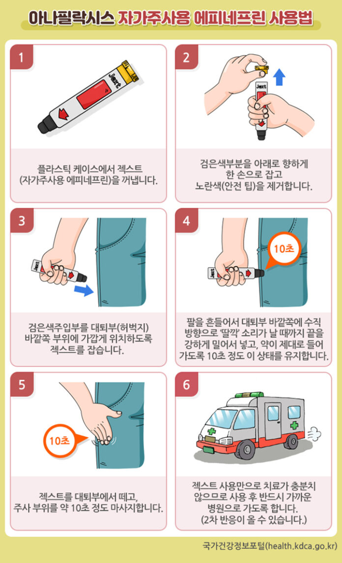 (4) 자가주사용 “에피네프린” 주사가 있다면 허벅지 바깥쪽에 근육주사 합니다.
